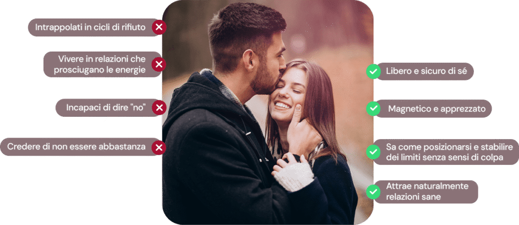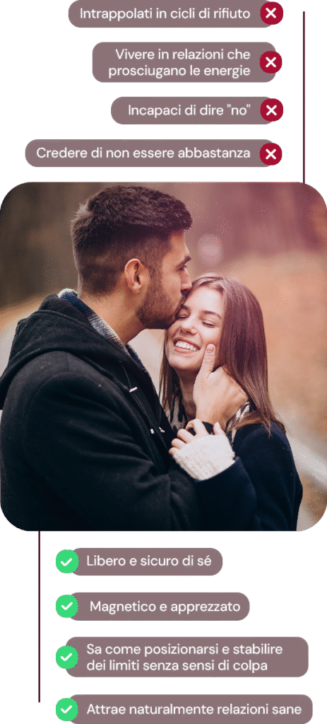 Il risultato? Non devi più correre dietro all’amore. Diventi la donna che naturalmente attrae uomini e connessioni che ti valorizzano, perché hai imparato tu stessa a valorizzarti.